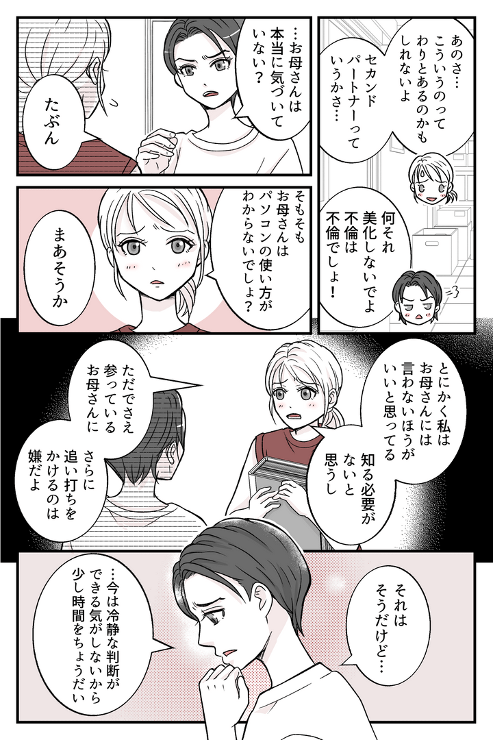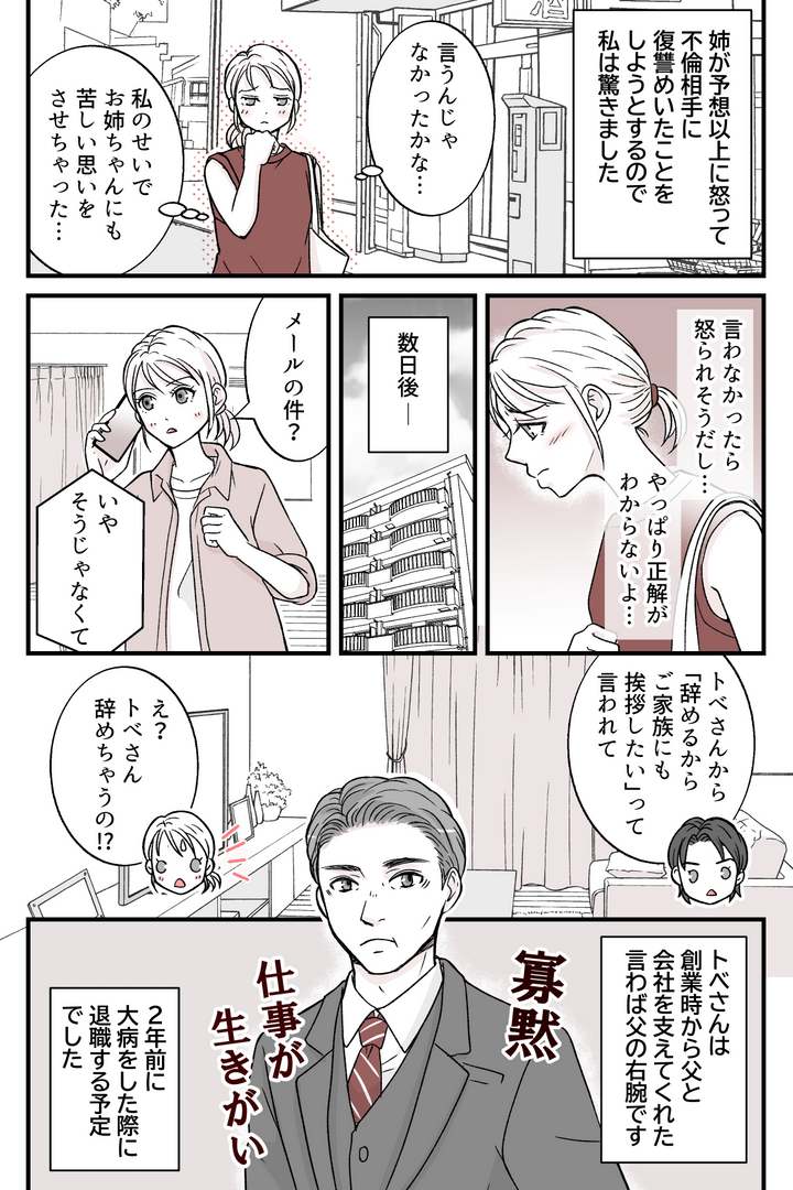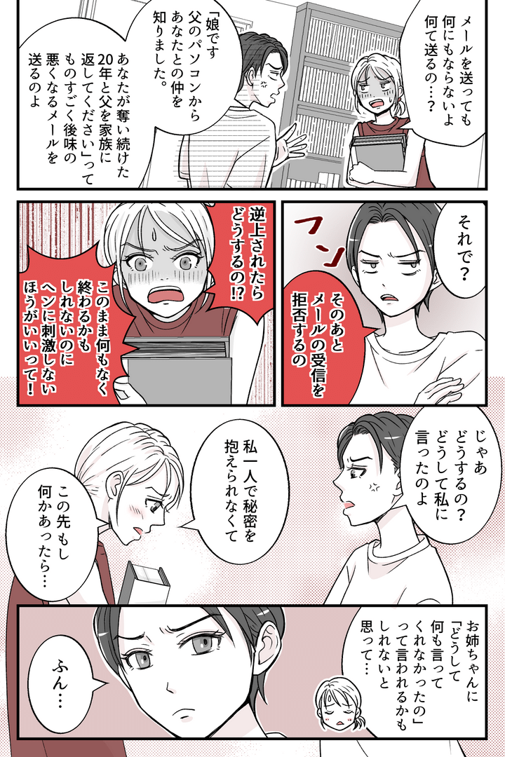 私(ミヅキ、28歳)は結婚1年目の会社員。私の父(トモヒロ、58歳)は経営者で、姉(ユキ、33歳、既婚)が父の仕事を手伝っています。母(サトミ、60歳)は専業主婦で、父の仕事には関わっていません。先日父が急死し、私は父の遺品から20年にもわたる父の不倫を知りました。私は親友たちに相談し、母には不倫を隠し通し、不倫の証拠となるメールは残すことに決めました。しかし結局、秘密を抱えきれなくなった私が姉に相談すると、姉は思いのほか激昂してしまったのです。