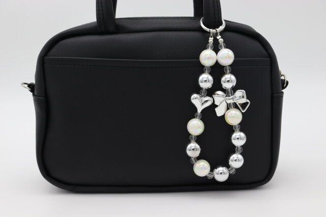 気になるストラップは、すべてのパーツが大ぶりで華やか。リボンやハートなど甘めのモチーフながら、カラーがシルバーとホワイトを基調としているので、スタイリッシュな印象です。