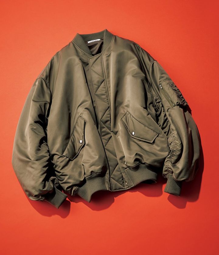 中綿入りのビッグシルエット。艶感や袖のシャーリングなど、随所に女っぽさも漂います。ブルゾン(サクラ/インターリブ)