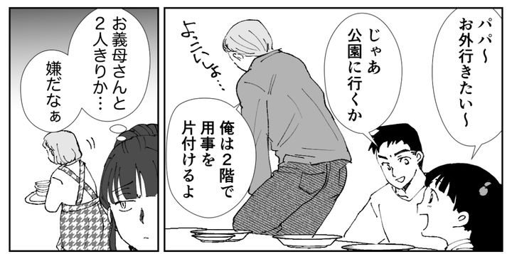 お昼ご飯の後、夫と娘は公園に、義父は2階に行くようです。義母と2人きりは嫌だなと思っていると……。