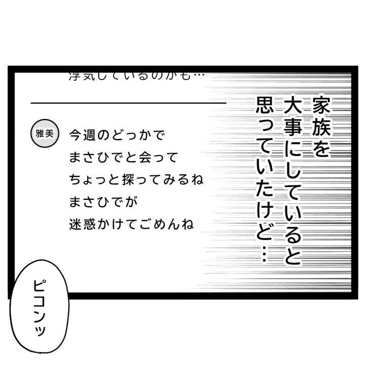 まさひでは家族を大事にしているように見えたけど・・。にわかには信じられませんでしたが、ゆかちゃんが不安に思っていることは確かです。「今週のどっかでまさひでと会ってちょっと探ってみるね。まさひでが迷惑かけてごめんね」と返信し、後日まさひでと会う約束をしました。