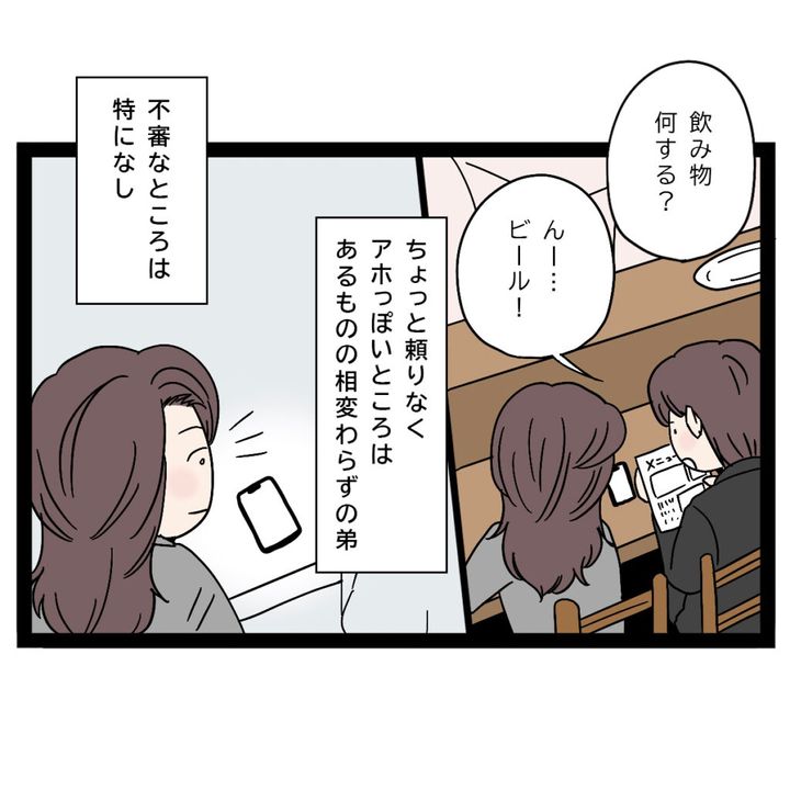 まさひでとは仕事の後に外でご飯を食べながら話すことにしました。ちょっと頼りなくてアホっぽいところはあるものの、相変わらずの弟。数日ぶりに会ったまさひではいつも通りで、今のところ不審なところは特になし。