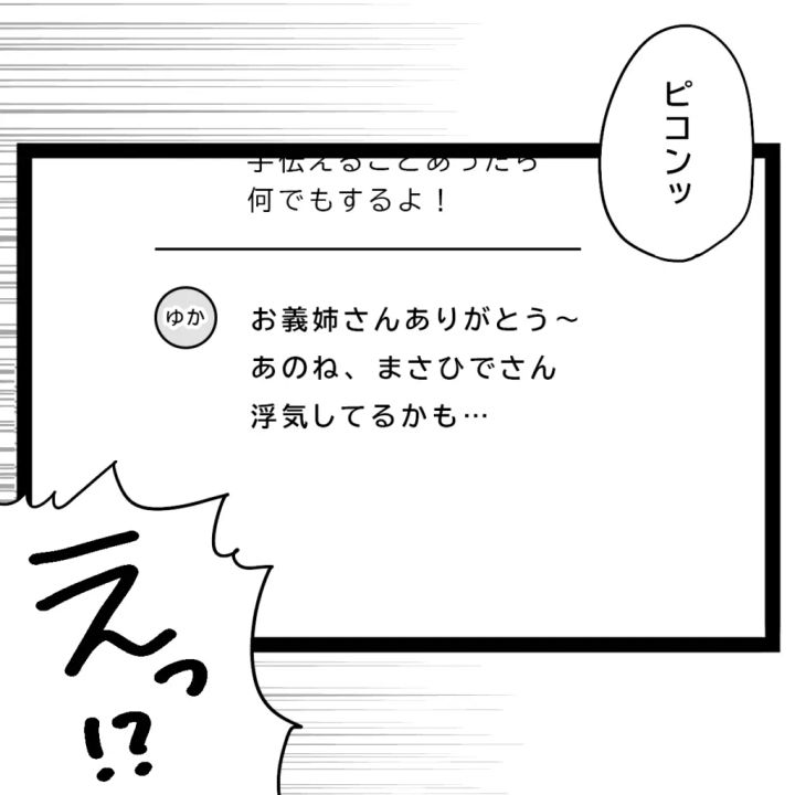 すると、ゆかちゃんから返って来たのは予想外の内容でした。「お義姉さんありがとう~。あのね、まさひでさん、浮気してるかも・・」驚きすぎて思わず「えっ!?」と声が出てしまいました。