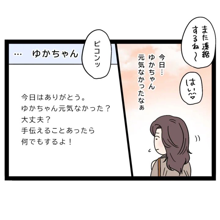帰り際、「また連絡するね~」「はい」といつも通りのやり取りをしたのですが、今日・・ゆかちゃん元気なかったなぁと少し気になっていた私は「今日はありがとう。ゆかちゃん元気なかった?大丈夫?手伝えることあったら何でもするよ!」とメッセージを送りました。