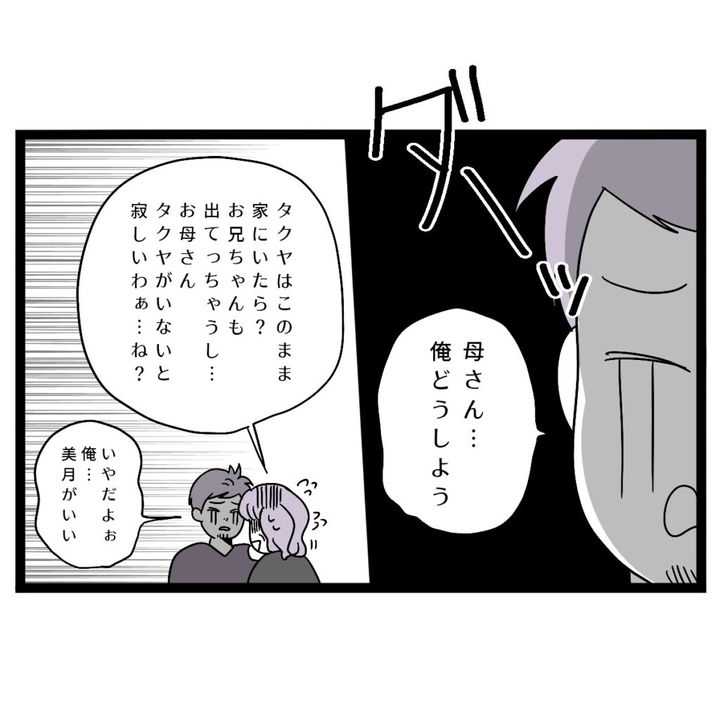 その後、「母さん・・俺どうしよう・・」タクヤが泣きながら義母にそう言うと、「タクヤはこのまま家にいたら?お兄ちゃんも出てっちゃうし・・。お母さん、タクヤがいないと寂しいわぁ・・ね?」義母がタクヤにそう言いながら近づくと、「いやだよぉ俺・・美月がいい」と義母の言葉を拒否しました。