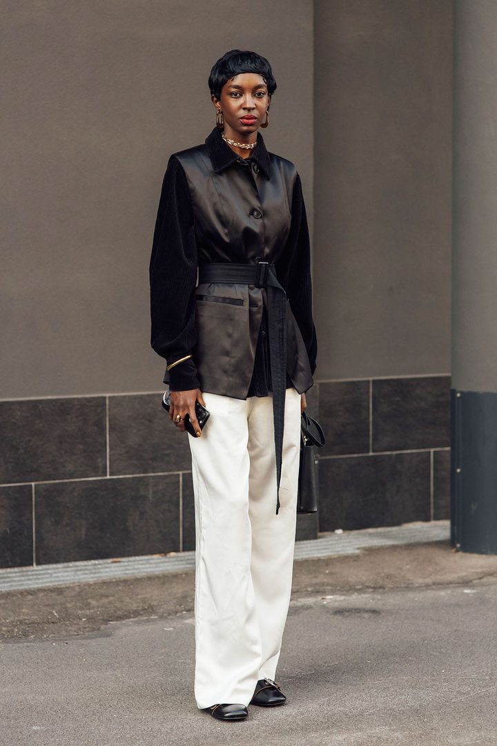 ブラックを軸にした着こなしに、あえて1点だけホワイトを投入。トレンドカラーの魅力が引き立つコーディネート。