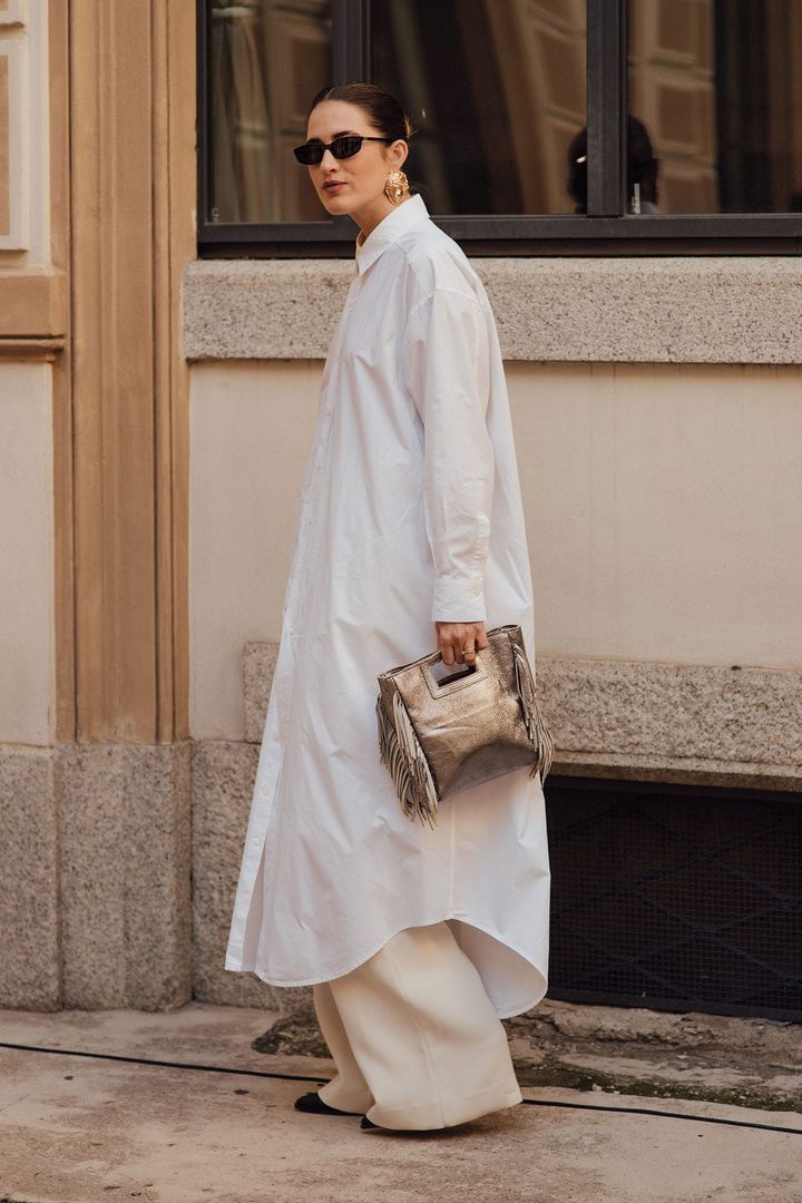 モードなロング丈とトレンドカラーの相乗効果で、ホワイトシャツが個性豊かに。メタリックカラーのバッグがスパイス役。