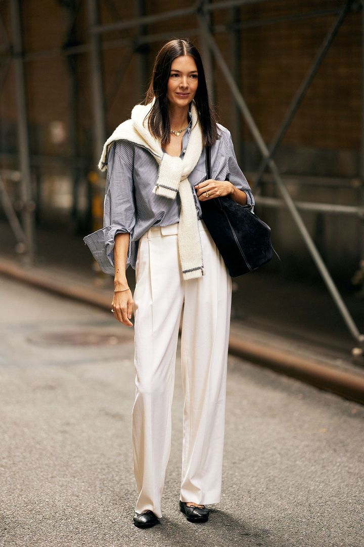 オフィスファッションの参考にしたいクリーンな着こなし。パンツだけでなく、肩がけしたニットも旬のホワイトをチョイス。