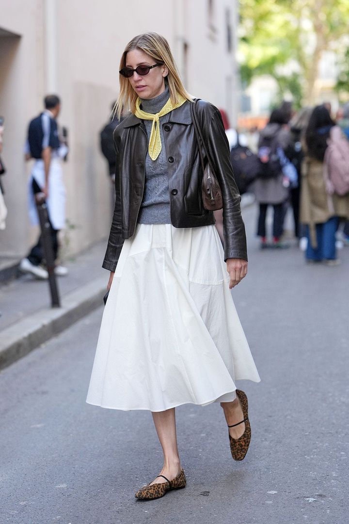 ピュアなオーラを放つAラインのホワイトスカートは、レザーアウターとアニマル柄シューズを合わせ、大人のムードにアレンジ。