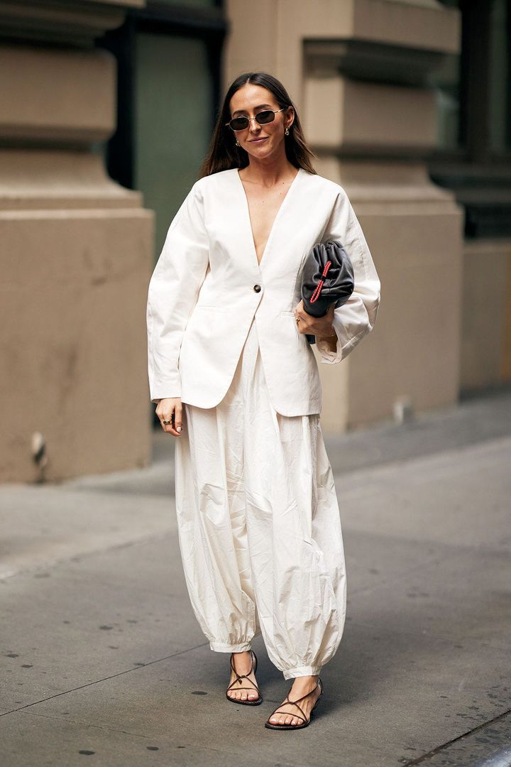 バルーンパンツが目を引くモダンなセットアップ。 “クラウドダンサー”の穏やかな個性と、軽やかなシルエットがマッチ。