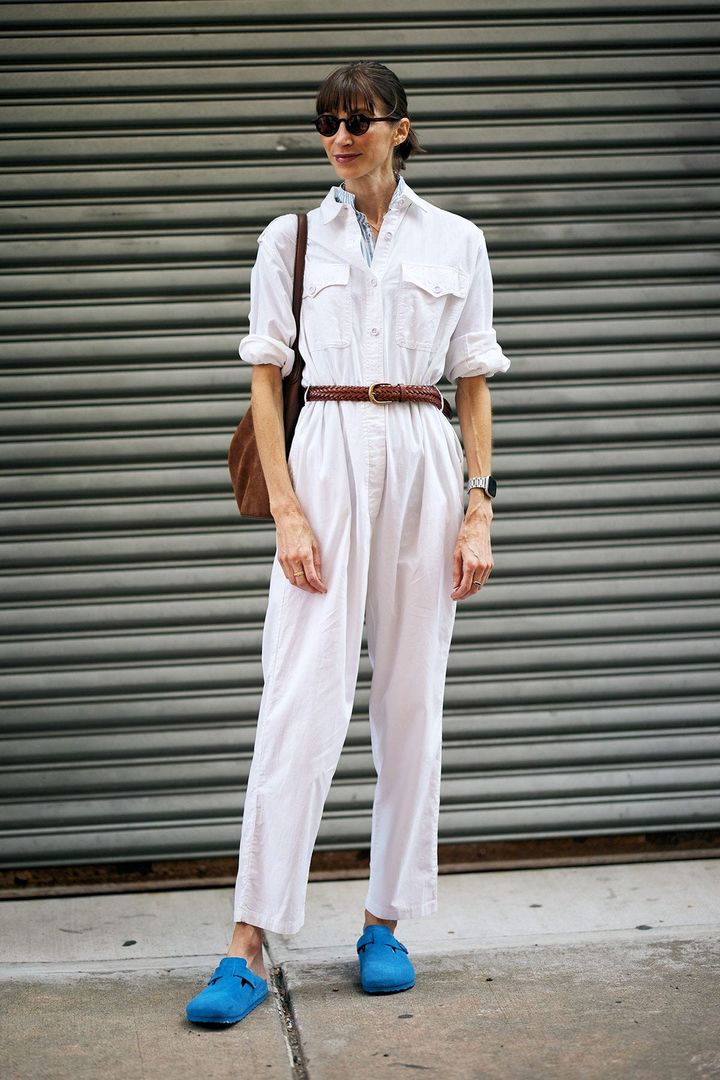 ワークテイストのオールインワンも、ホワイトが新鮮。インのストライプシャツをちら見せした着こなしや、ビビッドなシューズの利かせ方がハイセンス。