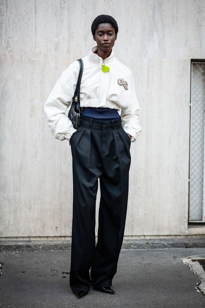 トレンドカラーと大胆な短丈の効果によって、おしゃれ度満点なスポーティージャケットを主役に。シンプルな着こなしも、たちまちモードに昇華。