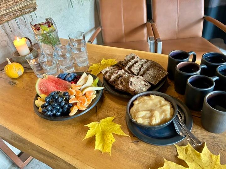 バスローブに着替えると、フルーツや黒パン、ハチミツ、温かい紅茶が用意されていました。