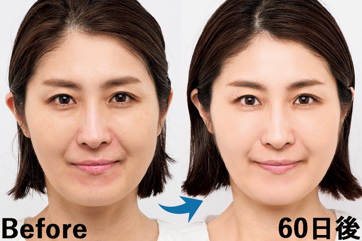 くすんでいた肌が明るくなり、顔全体にツヤも出現。顔色も良くなり血色がよくなったため健康的に!フェイスラインも引き締まり、顎下のゆるみもスッキリとして目元もぱっちり。ハリツヤ肌で小顔印象に。