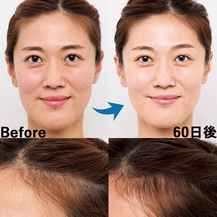 顎下のもたつきがスッキリして中顔面が短くなりました。毛穴の目立ちもなくなり、肌にハリが出てなめらかに。薄くなってきた髪の生え際に、しっかりとした毛が生えてきて毛量が増加! 小顔化したのも驚きの結果に。