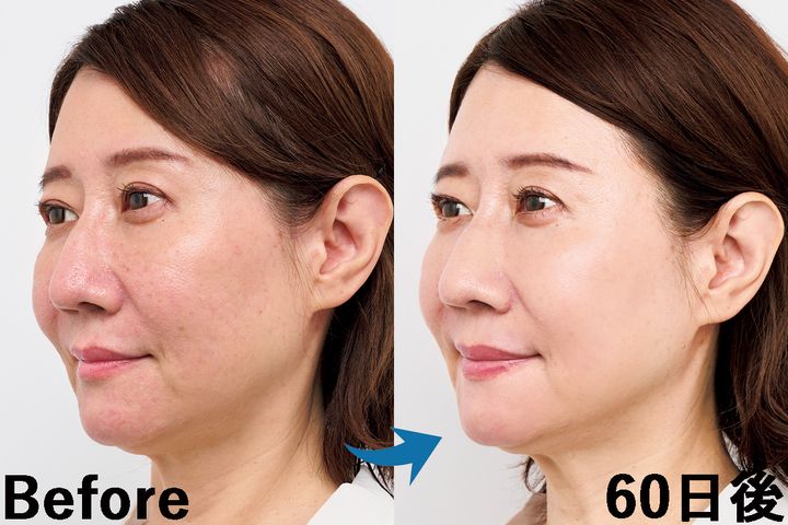 頰のもたつきが減り、顔がスッキリとひと回り小さくなったのが一目瞭然。特にフェイスラインがシャープになりました。肌の赤みも薄くなり透明感アップ。目まわりのたるみも取れて、顔立ちの印象が変わるほど。