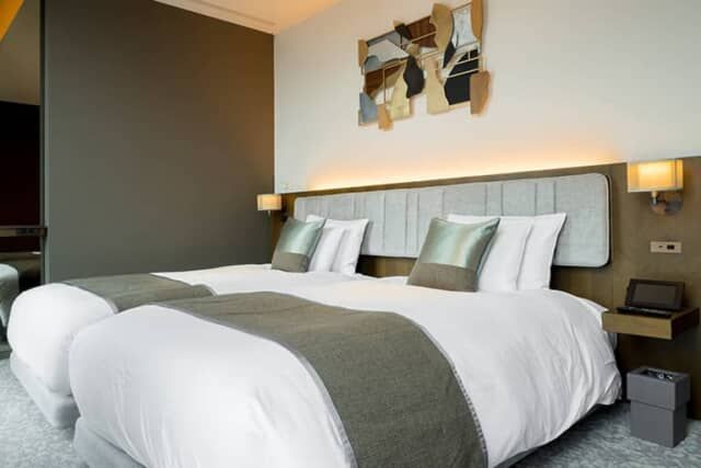 13階に2部屋ある「エグゼクティブツイン」は、リビングとベッドルームがセパレートした最も広い客室です。2名まで利用できる客室としては大きなソファーセットも置かれ、ゆったりとした時間を過ごせます。