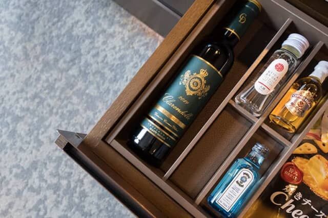 すべての客室にミニバーが用意され、ボンベイサファイアとシーバスリーガル、福井で製造されているKEYS & BRICKSのウォッカ、フルボトルのワインのほか、おつまみもそろえます。