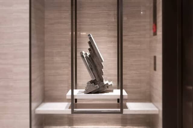 壁に架かる立体的造形は、銀座の風景を抽象的に表現した中林丈治氏の作品。すべての部屋に飾られています。