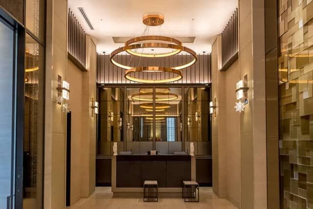 1階ロビーは天井高が6,5mと高く、差し色に金色が使われる上質な雰囲気。間接照明が天井を照らし、円形の照明からは柔らかな光が降りそそぐ、格調高い空間を演出しています。