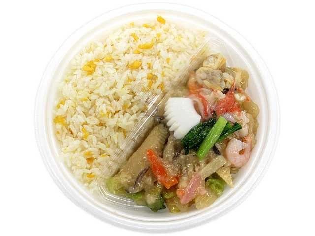 野菜、畜肉、魚介の旨味が効いた中華風の味付け。旨味たっぷりの餡と玉子のチャーハンを組み合わせたボリュームたっぷりの海鮮あんかけチャーハン。 カロリー:614kcal 【販売地域】九州