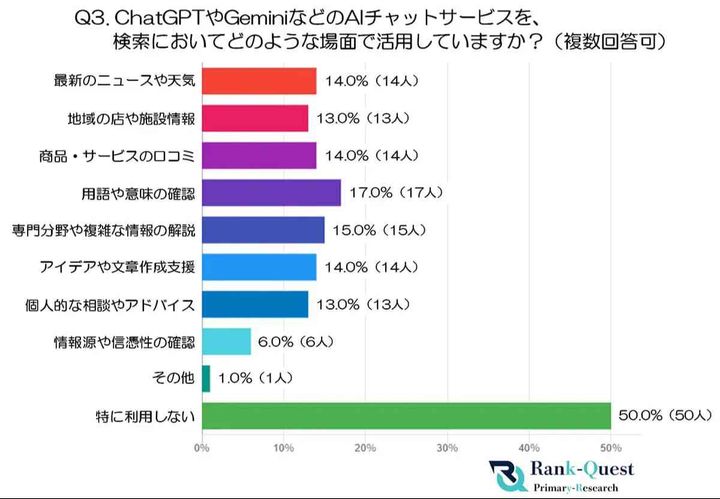 また、検索でAIを活用する場面は限られ、「特に利用しない」が50%と最多。用語確認や専門情報、文章作成など、従来型検索では補えない用途でAIを補助的に使う傾向が見られます。従来型とAI検索は置き換えではなく、併用することでより便利に活用できるようです。