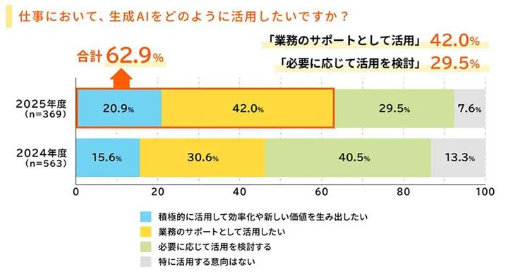 今後の業務に関しては、9割以上が生成AIを活用したいと回答。「業務のサポートとして活用したい」が最多で、積極的に効率化や新しい価値創出に活用したいと考える新入社員も増えています。生成AIは学生から新社会人まで、日常的なスキルとしてますます身近になりつつあります。