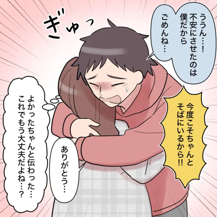 その後、「ううん・・!不安にさせたのは僕だから。ごめんね・・今度こそちゃんとそばにいるから!!」トモヤの言葉を聞いて、「ありがとう・・」と言いながら、「よかった。ちゃんと伝わった・・。これでもう大丈夫だよね?」と心の中で呟きました。