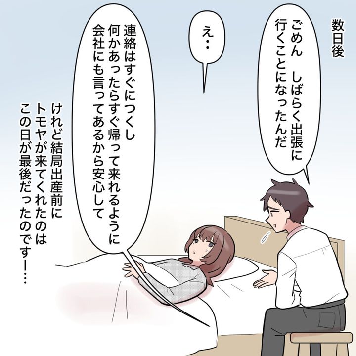 「ごめん。しばらく出張に行くことになったんだ」トモヤに突然そう言われ、「え・・」と驚くと、「連絡はすぐにつくし、何かあったらすぐ帰って来れるように、会社にも言ってあるから安心して」とは言ってくれたものの、結局出産前にトモヤが来てくれたのは、この日が最後だったのでした。