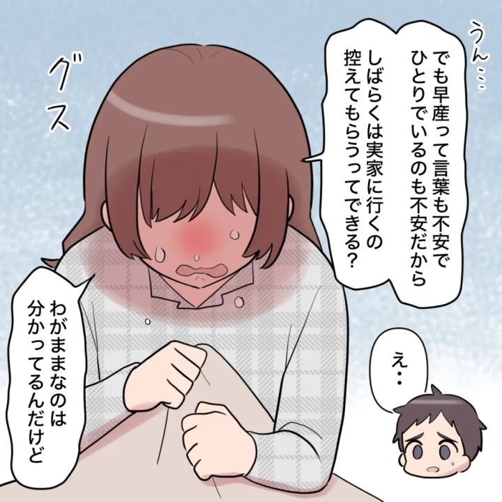 その言葉を聞いて、「うん・・。でも早産って言葉も不安で、ひとりでいるのも不安だから、しばらくは実家に行くの控えてもらうってできる?わがままなのはわかってるんだけど」と涙を流しながらそう言うと、「え・・」と何も言えなくなるトモヤ、