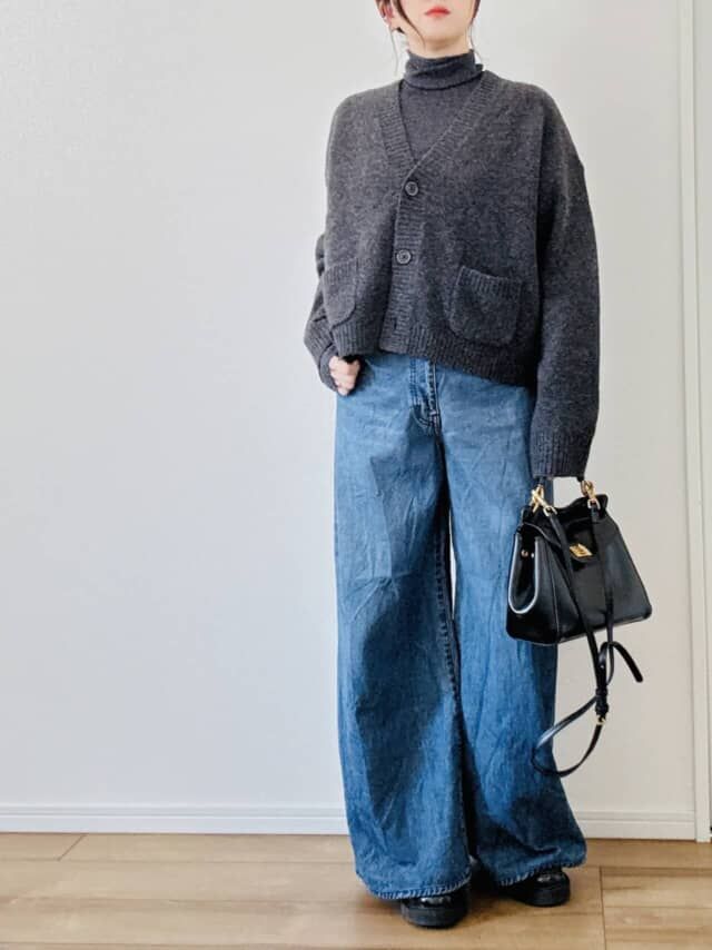 特におすすめは、ほんのり透け感のあるシアータートル。重さが出がちな冬コーデに軽さが出て、黒やグレーなど濃色デニムとも好バランス。首元はくしゅっとたゆませると、こなれ感が出て真面目すぎない雰囲気に。ショート丈カーディガンとの相性も抜群で、上半身にメリハリが生まれ、自然とスタイルアップが叶います。