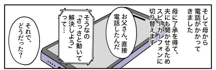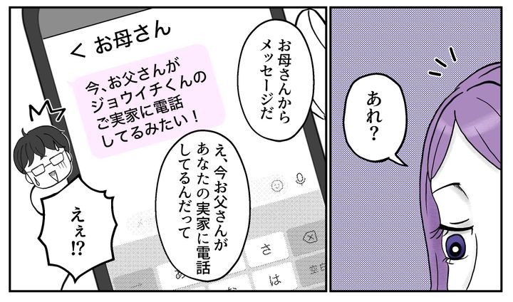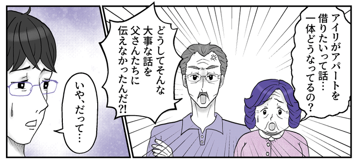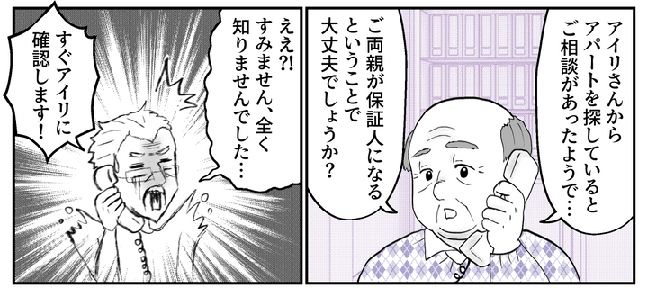 アイリちゃんはもともと、義両親に内緒で部屋を借りようとしていました。しかし事情を聞いたうちの父は、なんと義両親に直接電話をしたようです。アイリちゃんの味方をして、内緒で話を進めようとしていた夫は大慌てです。