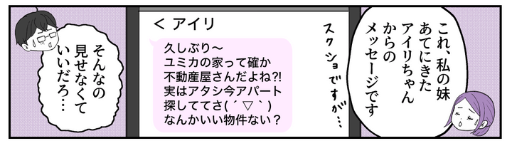 私はノドカ(28歳)。夫ジョウイチ(33歳)と暮らしています。先日夫の妹であるアイリちゃん(22歳)が、私の両親が所有しているアパートに住みたいと言ってきたそうです。アイリちゃんは義両親の怒りを買い、生活費の援助を絶たれています。入居しても家賃を滞納してしまう可能性が高いのです。けれど夫は年の離れた妹のアイリちゃんを溺愛していて、「可哀想に」と甘いことを言っていて……。私は実家の母に相談した結果を、夫に伝えました。