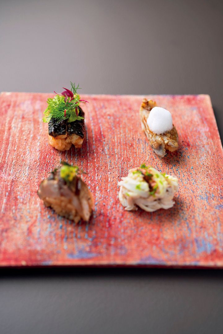 夕食に登場する寿司。とらふぐや渡り蟹、鰻やさばの握りは、夕日をイメージした器で。 撮影=野中 元