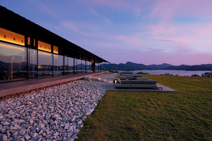 有明海に沈む夕日を望む本館棟とアウトドアリビング。全長50メートルの本館棟にはダイニングと、夜にはバーとなるフロントラウンジがある。 撮影=野中 元