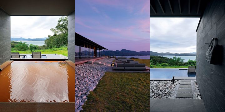 「穏やかな有明海が目の前に広がり、そのスケールに魅入りました」と岩佐さん。ウエルカムドリンクのシャンパンをゆっくり楽しんだあとは、専用のカートでそれぞれのヴィラへ。各棟は、地下820メートルから湧く茶褐色の自家源泉が掛け流しで楽しめる温泉付き。「塩分濃度が高く、湯上がりも心地よく体が温まります」と前田さん。