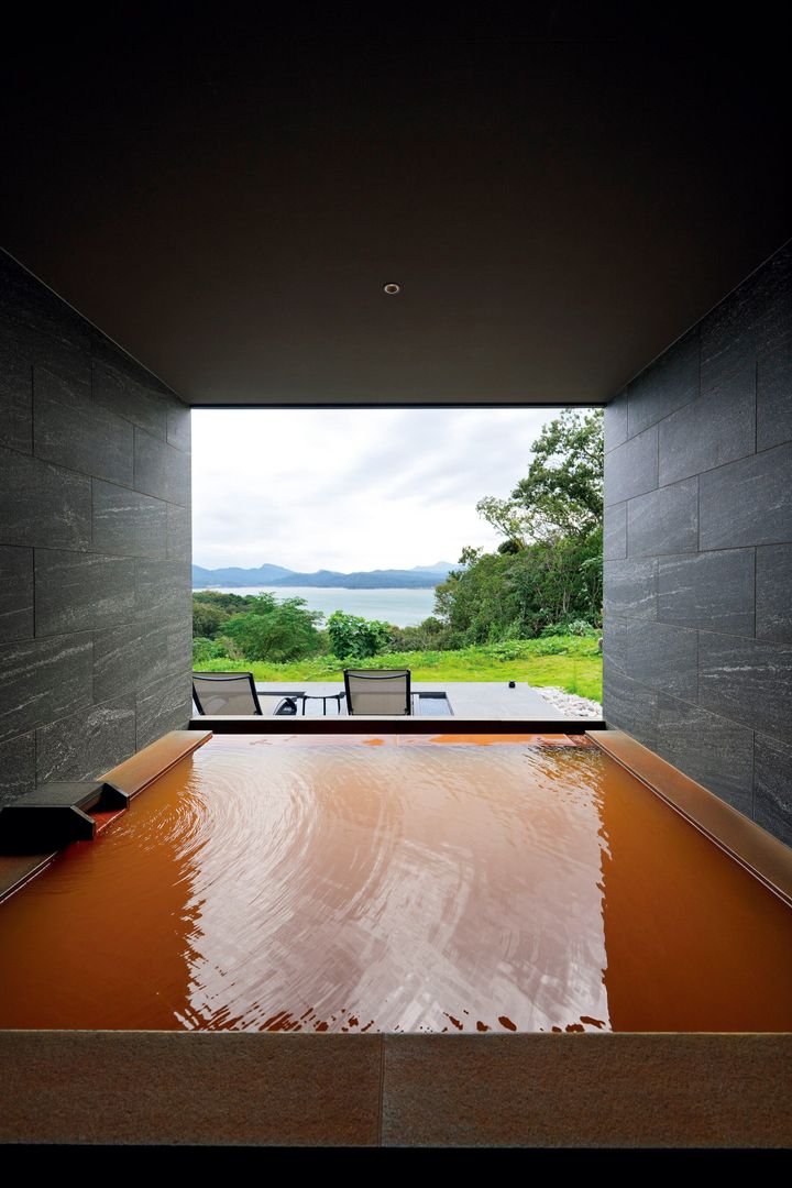 絶景を眺めながら温泉が楽しめる、外気が心地よいヴィラ内の風呂。硫黄やナトリウムなどがたっぷりと入った温泉が注がれている。 撮影=野中 元