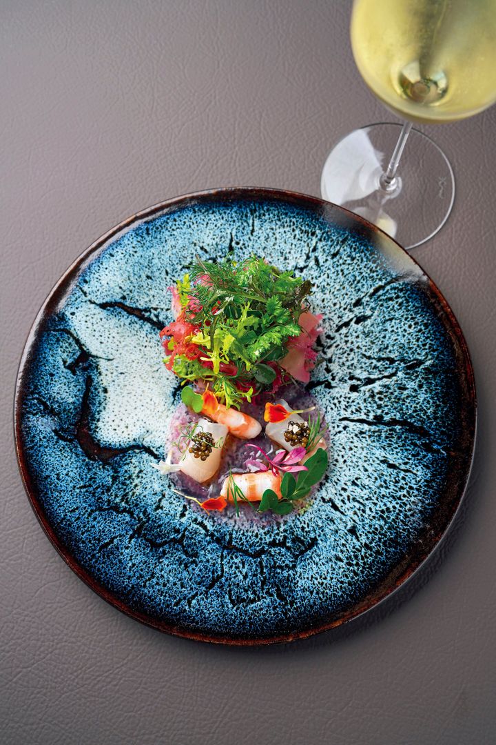 16品の夕食のコースから。天草の車海老や石垣鯛に、取れたての海藻とハーブをのせたひと皿。 撮影=野中 元