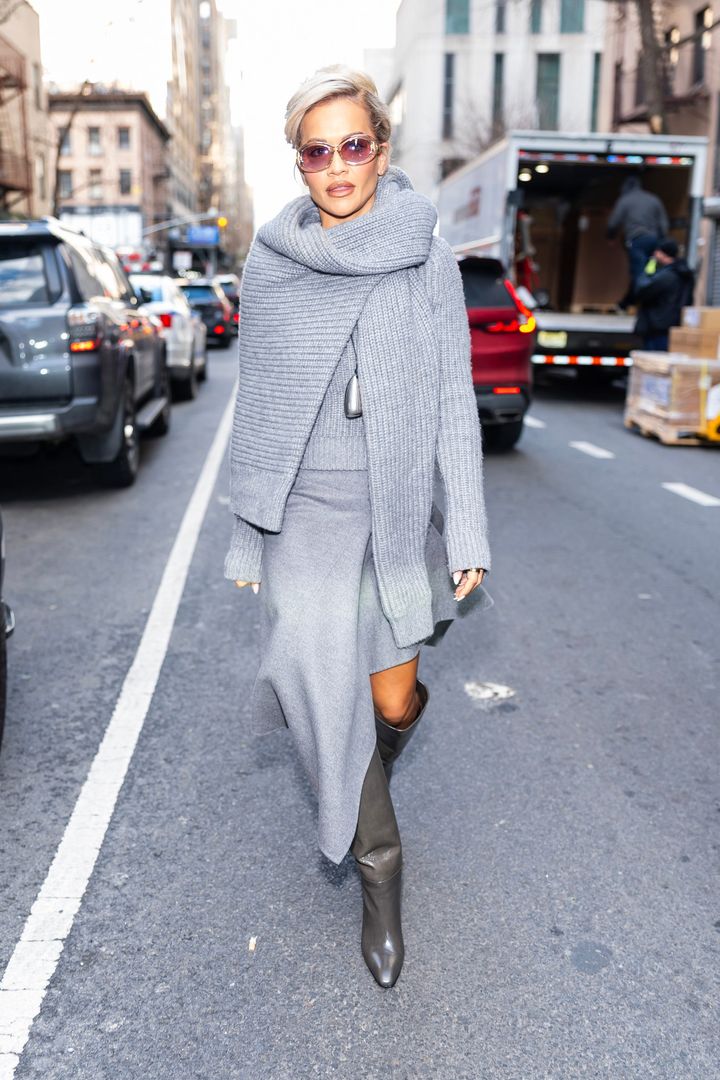 リタは、「マイケル・コース」の洗練されたワントーンルックをチョイス。ボリュームのあるニットをケープのように肩から羽織り、同素材のトップスとアシンメトリーなミディスカートで奥行きを演出。足もとはポインテッドトゥのレザーロングブーツで引き締め、都会的でエフォートレスなムードに。