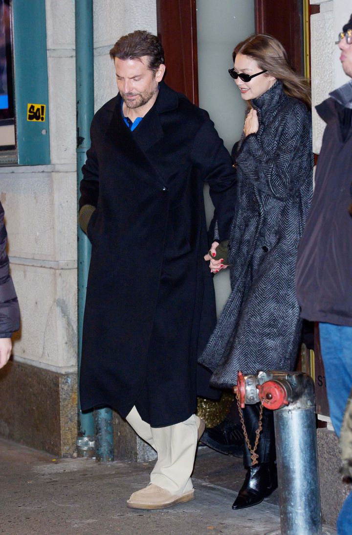 ジジは、ブラッドリーと手をつないでブロードウェイの観劇へ。この日は、自身のニットウェアブランド「ゲスト イン レジデンス」からダブルブレストコートをチョイス。洗練されたグレーのヘリンボーン柄が印象的な一着の裾から、レザーのワイドパンツとポインテッドトゥのブラックアンクルブーツを覗かせた。