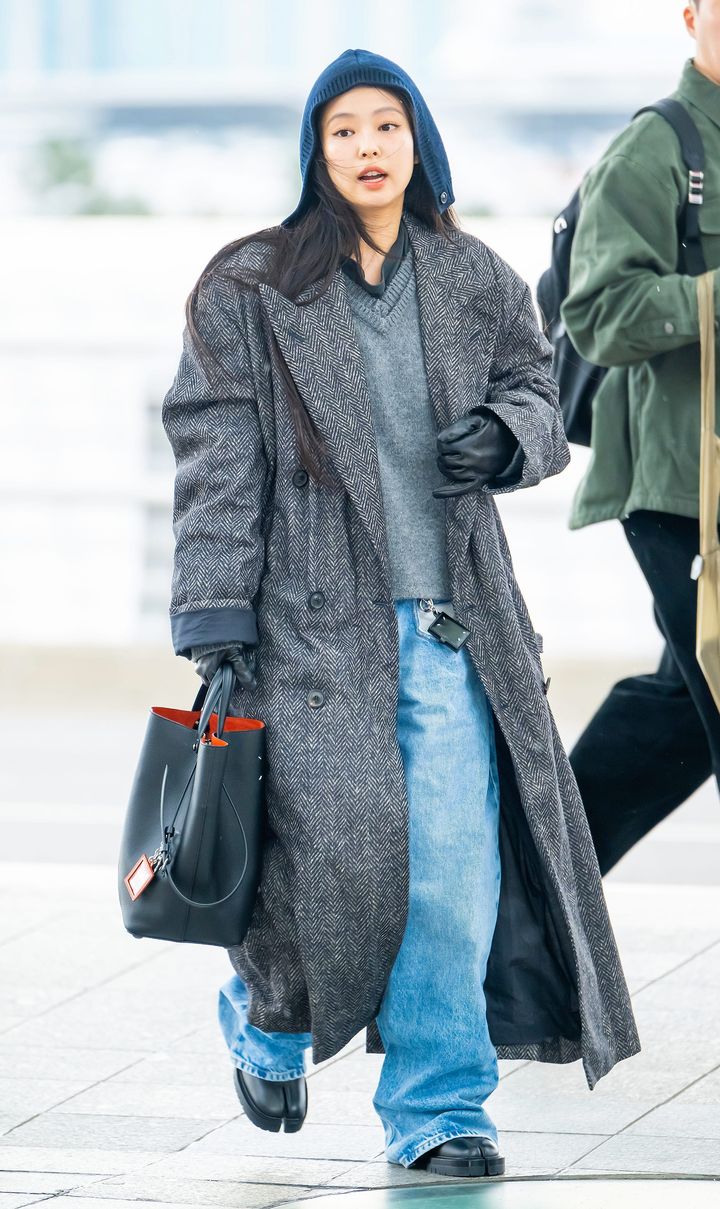 オール「メゾン マルジェラ」の空港ファッションを披露したジェニー。グレーのフロアレングスコートを軸に、デニムとニット帽で程よくカジュアルダウン。仕上げには、内側からレッドがのぞく“ドレサージュ”バッグを添え、ミニマルな装いにさりげないアクセントを効かせた。