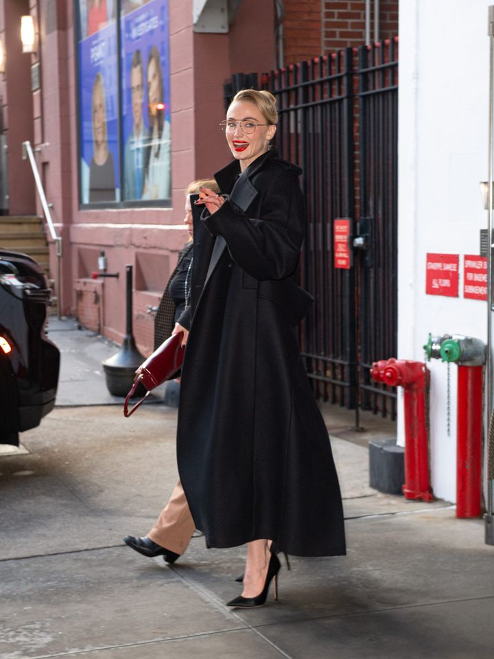 パワードレッシングを現代的に昇華したルックで、ニューヨークのスタジオに向かったソフィー。ファネルネックとパワーショルダーが印象的な「ケイト」のコートに「セルフ・ポートレイト」のツーピーススカートスーツを合わせて、端正なオフィスムードに。クラッチ持ちしたレッドバッグやクリアフレームのアビエイターが、装いにモードな緊張感を添えた。