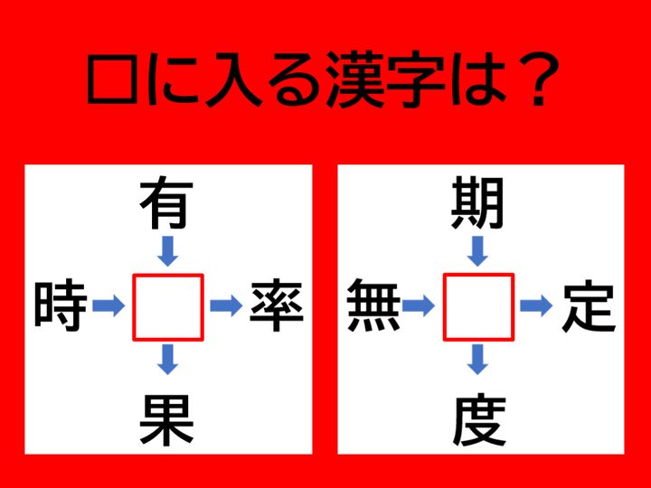 【漢字パズル】脳トレに挑戦!有□、時□、□果、□率、に入る漢字は何?