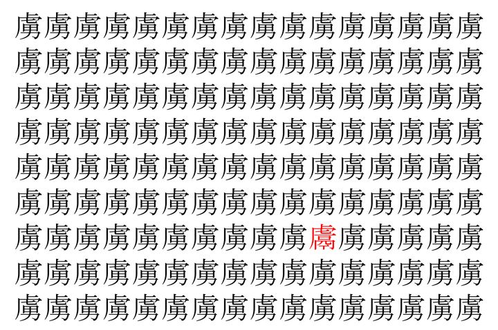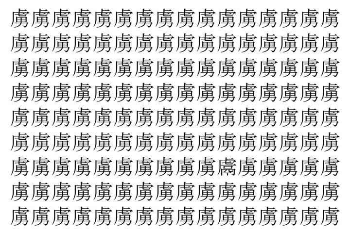 画像の中には、「虜」という漢字が縦に9行、横に16個並んでいます。 全部で144個となりますが・・・、そのうち1つは「異なる漢字」となってますよ!!