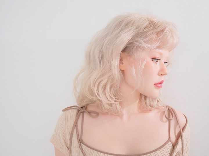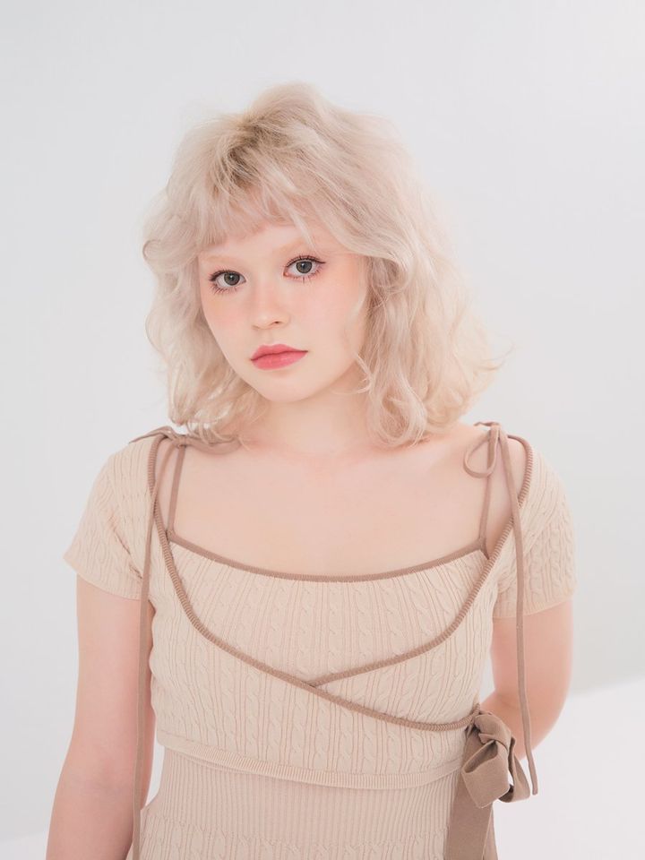 3回ブリーチで仕上げたホワイトベージュは、黄ばみを抑え、肌の透明感もアップ。全体をウエーブ巻き、ポイントで表面に細かいカールをプラスしてボリュームを出し、力が抜けた柔らかな印象に。淡色のワントーンコーデにすることで髪の柔らかさが引き立ち、底抜けなピュア感が爆誕。