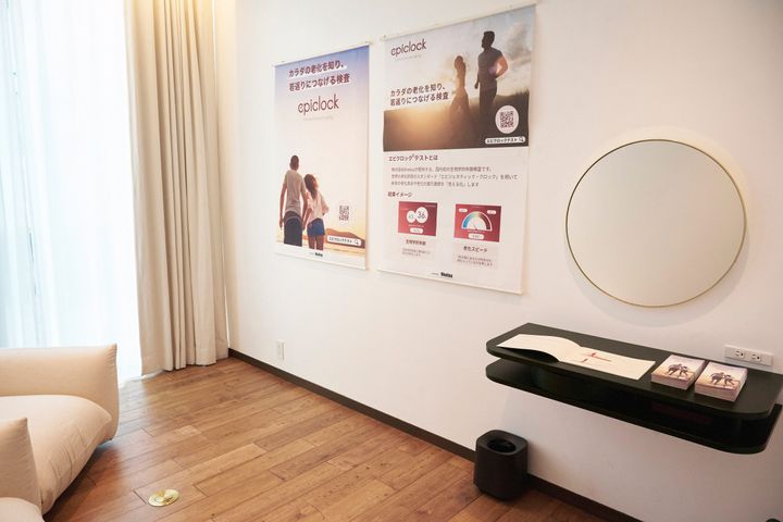 同施設でも体験できる「エピクロック®テスト」は、世界で初めて日本人向けに同社が開発した先進的なサービスのひとつ。世界の老化研究のスタンダードとなっているエピジェネティッククロック解析を用い、身体の状況を測定します。イベント特典として、「エピクロック®テスト」(通常 ¥165,000) の次回予約 10%OFFが提供されました。