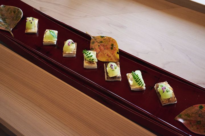 セミナー当日は、カウンター席でこの日だけの特別な鮒鮓や食材をミルフィーユ状に重ねたフィンガーフードが振る舞われたほか、次回予約時にファーストドリンクがサービスされる特典(本セミナー参加者限定)が提供されました。