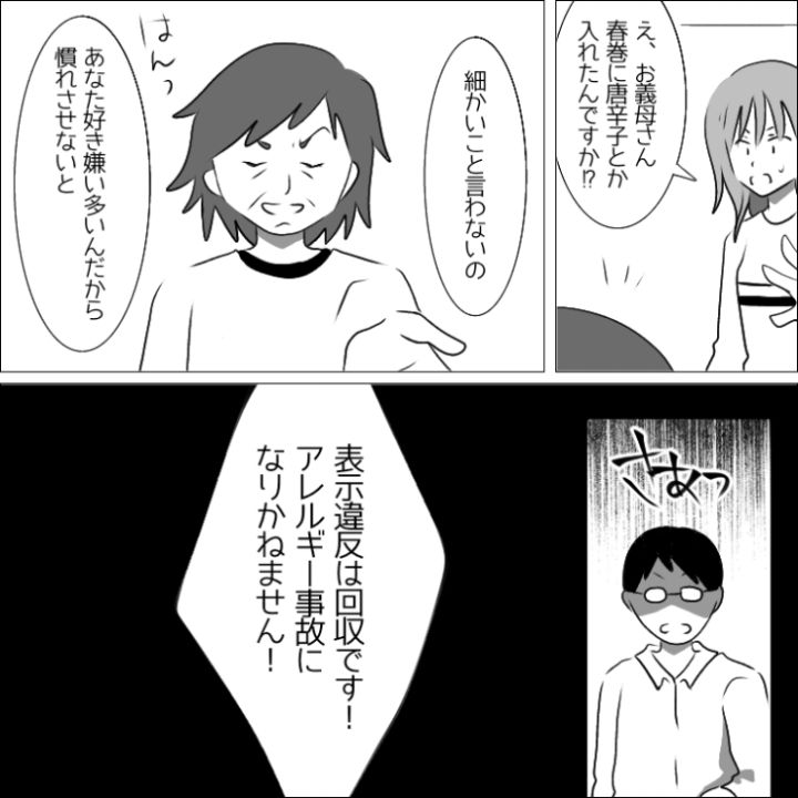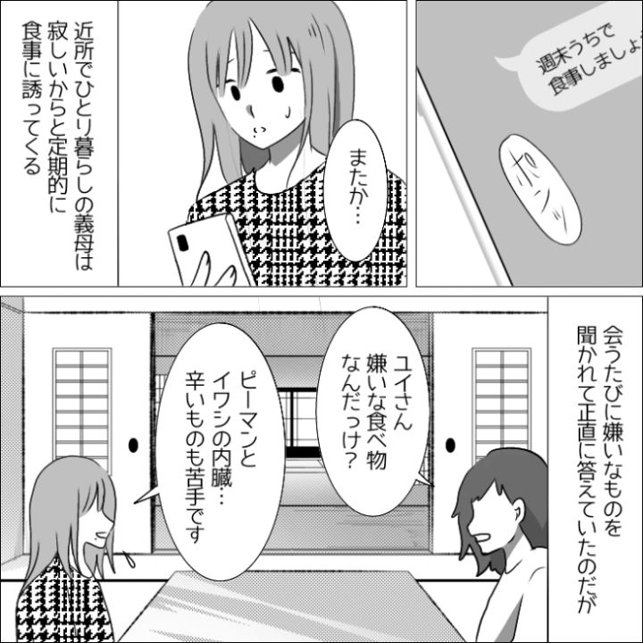 衝撃のエピソードを漫画化!今回は家で一緒に食事をしようと誘ってきてわざと主人公が苦手なものばかりを食卓に並べる義母のお話をご紹介します。