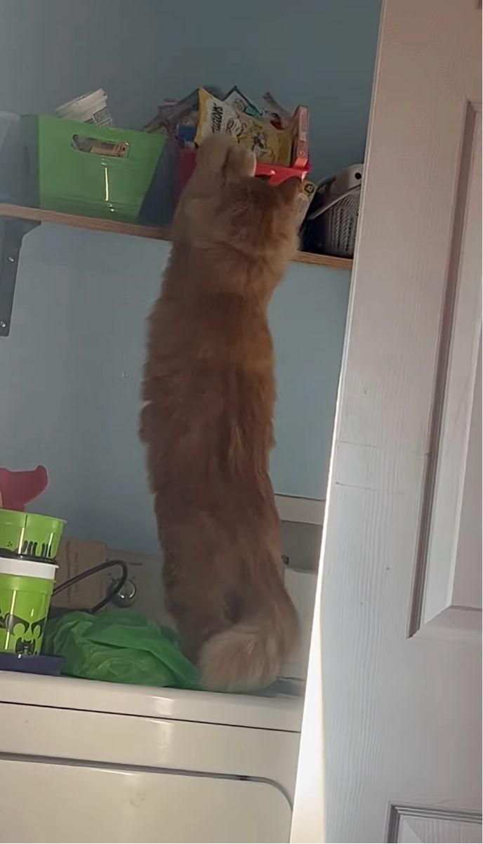 棚の箱に入ったおやつをナイショで取ろうとしたけれど・・。ネコのイタズラを目撃!【アメリカ・動画】