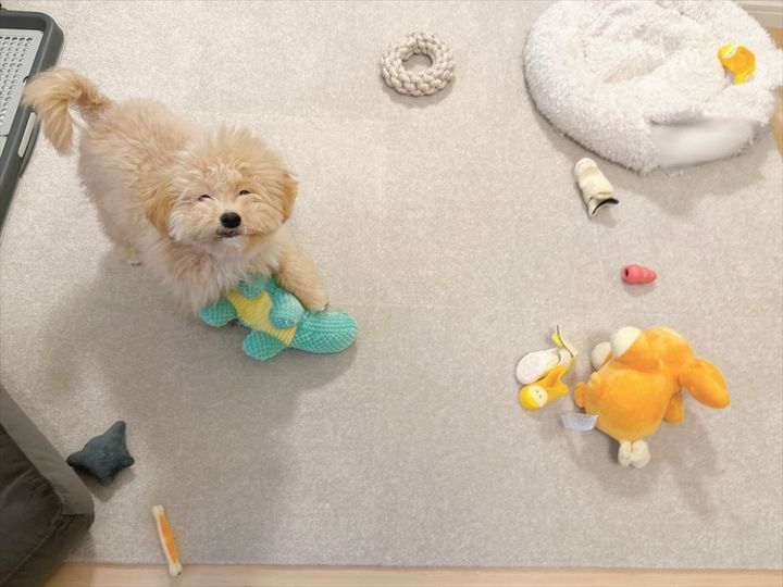 たくさんのおもちゃで遊ぶ、笑顔のマルプー。 しかし、それはイタズラの証拠でもあったみたいです!